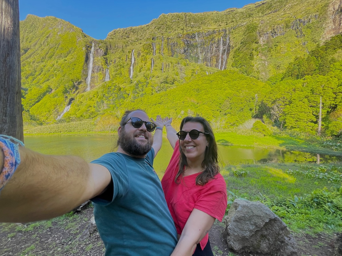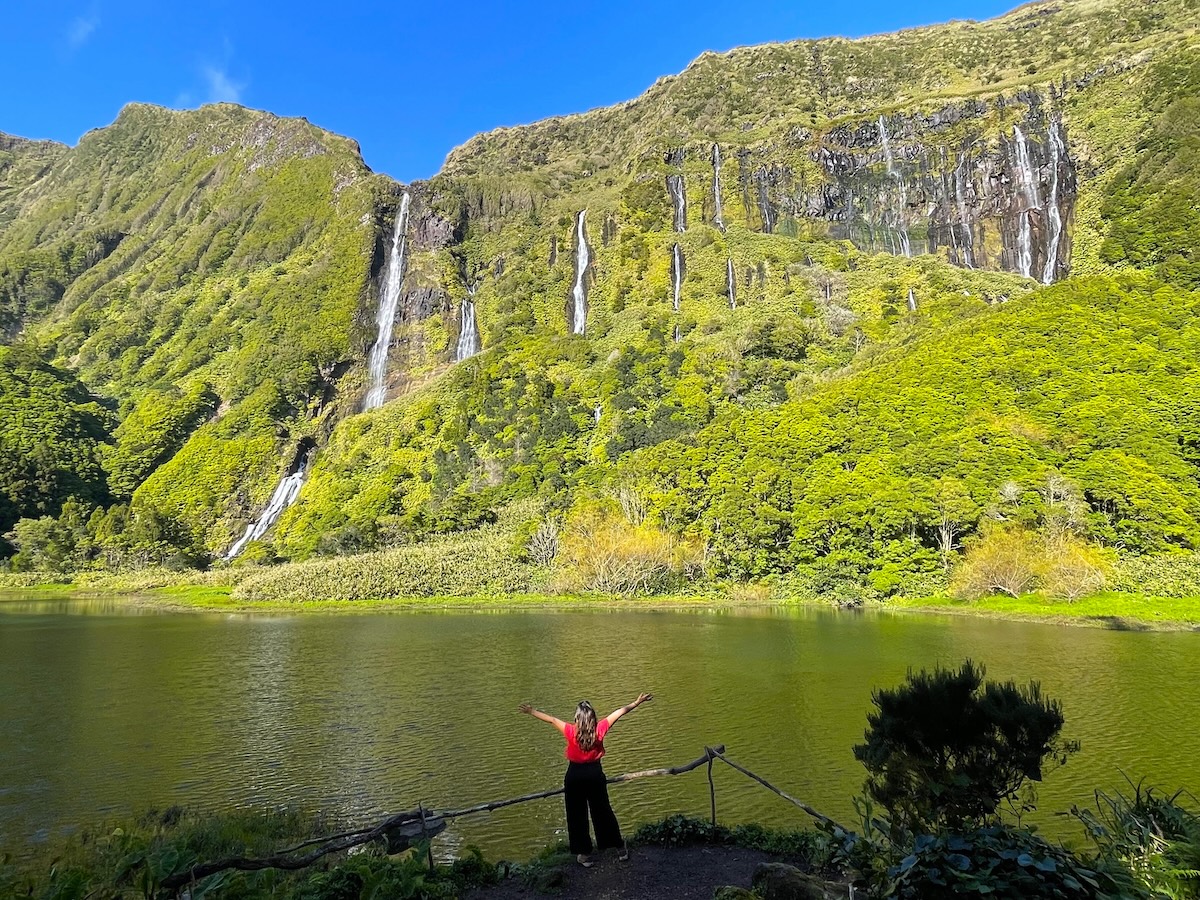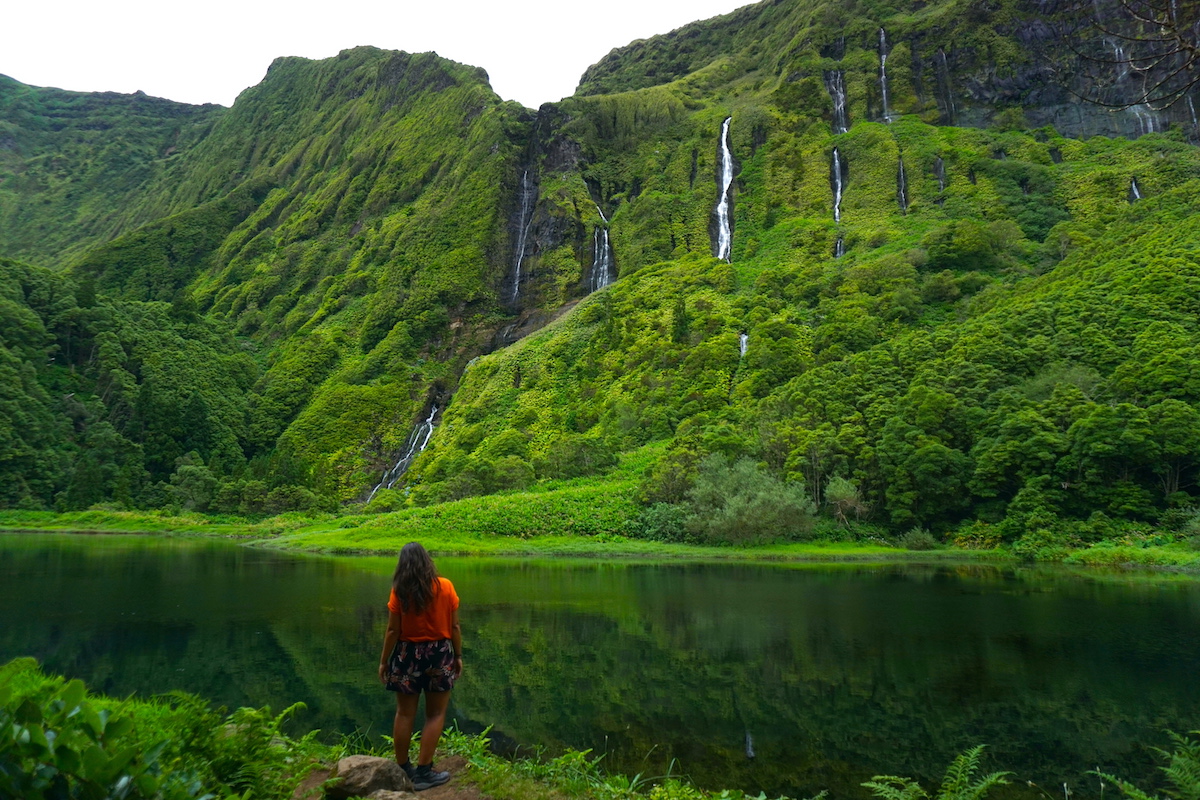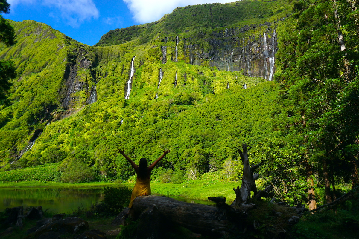 Bienvenidxs al Parque Jurásico, perdón, Flores. El Poço da Ribeira do Ferreiro (también conocido como Poço da Alagoinha o Lagoa das Patas) es de los paisajes más deslumbrantes que hemos visto en nuestros viajes por el mundo así que nos arriesgamos a decir, sin miedo a represalias, que al visitar este lugar estarás visitando uno de los más bellos lugares de Portugal. La imponente laguna rodeada del acantilado verde de unos 200 metros de altura salpicado por diez o veinte cascadas no deja indiferente a nadie y, de hecho, cuando puedas cerrar la boca estarás expectante por si un tiranosaurio rex está al acecho. El espejo de agua refleja y duplica la belleza de dichas cascadas.