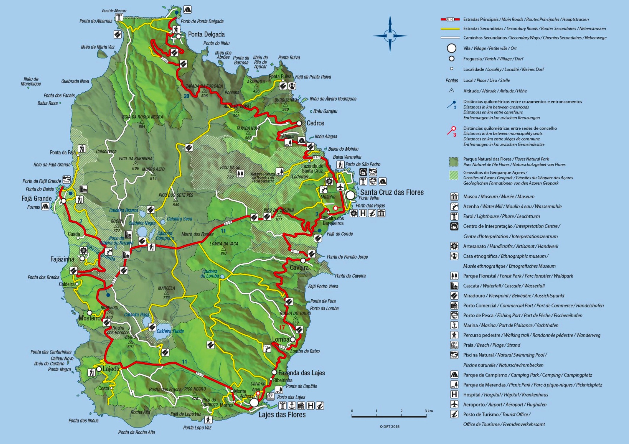 Y aquí te dejamos también un mapa turístico con las carreteras de Flores (haz click en la imagen para descargarlo en mayor tamaño y resolución)